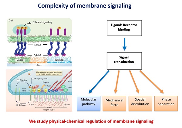 The membrane systems, composed of lipid bilayers, membrane proteins and the surrounding cortex, form the fundamental structures to compartment a cell and its organelles. It is becoming increasingly clear that the membrane-based reactions are not only affected by chemical modifications, such as protein phosphorylation, but also involve crucial physical aspects such as spatial organization, mechano-transduction, phase separation, curvature-sensing, and confinement. All together they contribute to the accurate modulation of cellular functions including signaling transduction on plasma membranes, membrane trafficking in organelle vesicles, and gene transcription near nuclear envelopes. A key question in these systems is how the physical-chemical elements are integrated precisely in mesoscale (10nm-1µm), the scale at which molecules transiently associate with each other to exert a defined function.
