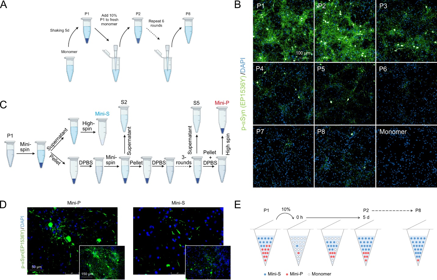 通过体外模拟病理种子的连续扩增(图2A),研究团队发现:初始纤维(P1)在神经元中的病理诱导活性显著高于多次传代后的纤维(P8)(图2B)。进一步分离出两种纤维多态体Mini-P(高致病毒性)和Mini-S(低致病毒性),发现其比例变化是致病毒性衰减的主因(图2C-E)。