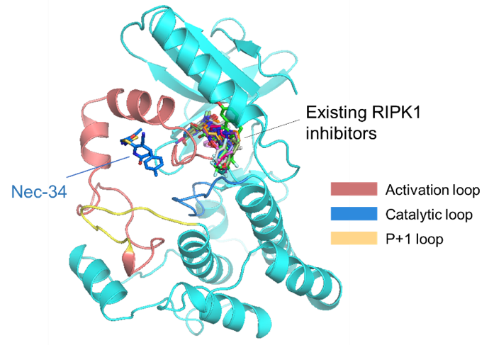 受体相互作用丝氨酸/苏氨酸-蛋白激酶1(RIPK1) 是参与调控细胞凋亡、细胞程序性坏死以及炎症反应的关键因子,在多种人类疾病,包括神经退行性疾病,自身免疫性疾病以及多种炎性疾病中,都观察到了RIPK1的病理性激活。由袁钧瑛教授在2005年首次报道的Nec-1是第一个发现的靶向RIPK1的小分子抑制剂,后经过进一步的结构优化后的小分子Nec-1s展现出了更好的活性和特异性,并在多种动物疾病模型中验证了靶向RIPK1的激活可以有效缓解疾病的发生发展。 因此,近年来RIPK1成为了一个极有开发前景的药物靶点,针对于RIPK1激酶抑制剂的设计和开发也在如火如荼的进行。目前多个RIPK1激酶抑制剂,都成功的完成了临床一期试验,结果显示在人体上具有较好的耐受性和安全性,这表明靶向RIPK1的激酶活性在临床上是安全的,这也为后续RIPK1激酶抑制剂的临床应用奠定了基础。目前针对于RIPK1激酶抑制剂研究的瓶颈主要有两点,一是仅有非常有限的化学型被发现,二是目前发现的所有RIPK1抑制剂的主要靶向同一个疏水口袋,没有新的靶向其他结合口袋的RIPK1抑制剂被发现。
