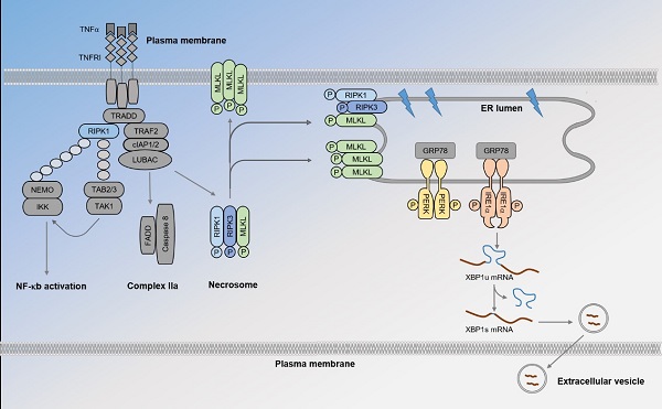 作者利用邻位连接技术(Proximity ligation assay, PLA)对内源的necrosome进行可视化研究。该方法不仅可以检测体外培养细胞中的necrosome,对小鼠组织中necrosome也有很好的检测效果。在此基础上,作者探索了necrosome的亚细胞定位并发现有较多比例的necrosome定位在内质网(ER)中。内质网是细胞内可分泌蛋白的折叠场所,当蛋白折叠受阻时,内质网的未折叠反应(unfolded protein response, UPR)信号通路会被激活,UPR由定位在内质网上的三个感应蛋白PERK、IRE1、ATF6介导。作者发现necroptosis可以激活PERK,IRE1和ATF6信号通路,促进IRE1对其下游底物XBP1 mRNA的剪切,而被剪切的XBP1 mRNA可通过囊泡(Extracellular Vesicle)被释放。该发现提示了发生程序性坏死(necroptosis)的细胞可通过细胞外囊泡内的RNA组分发挥细胞间通讯作用。