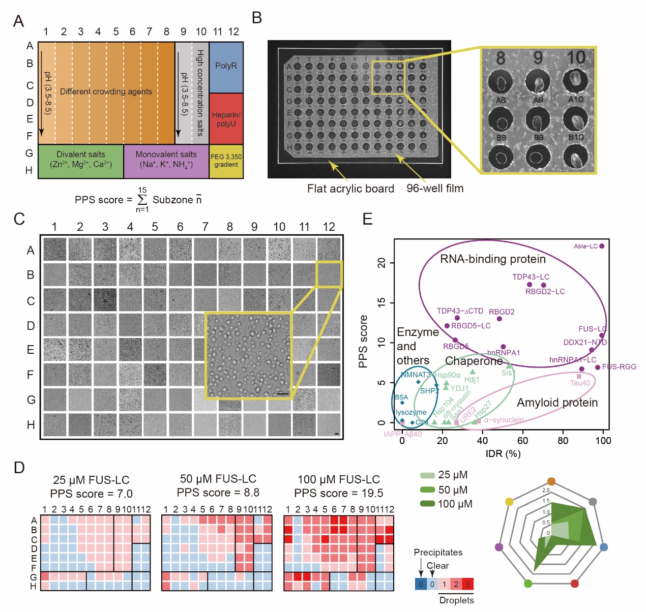 在本工作中,研究者基于已有的文献数据整理并总结了诱导蛋白质发生LLPS的不同条件,并建立了适用于体外筛选的96孔板筛选系统。通过自动点样机器人降低蛋白质样品的使用量,以及结合高内涵筛选系统快速拍摄方法,达到短时间高通量的鉴定不同条件下多个不同蛋白质样品的LLPS (图1)。同时,对筛选结果进行赋值(PPS score),并结合LLPS space来系统比较不同蛋白质系统LLPS的能力。研究者首先通过对已知的相分离蛋白进行筛选验证了96孔板筛选系统的实用性,接下来对近30个不同的蛋白质样品(RNA结合蛋白,淀粉样蛋白,分子伴侣,蛋白酶等)进行筛选,发现并鉴定了各个蛋白质所具备的相分离条件,计算出不同蛋白的LLPS space,并揭示了蛋白质相分离潜在的通用属性(图1)。