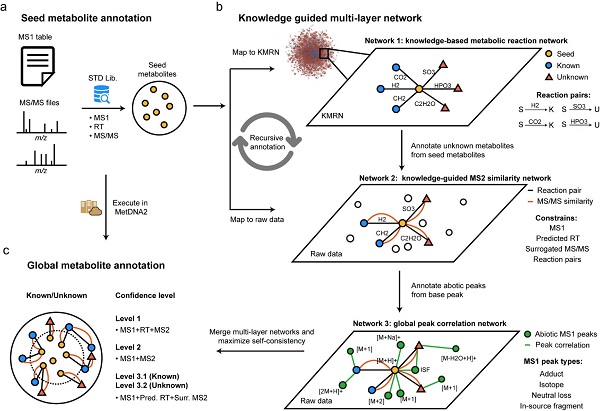 生命体代谢组不仅包含内源性产生的已知代谢物,还包含微生物菌群、植物、食物和其他来源的未知代谢物。这些未知代谢物对生命活动起到重要的调控作用。然而,如何大规模鉴定未知代谢物是当前代谢组学研究中的热点和难点。在前期研究中,朱正江课题组发展了基于代谢反应网络的代谢组学技术MetDNA(Nature Communications, 2019, 10: 1516)。该技术利用代谢反应网络中产物和底物存在结构相似性和二级质谱图相似性的基本原理,设计了代谢物二级质谱图“谱图借用”和“多次迭代”算法,利用标准谱图库鉴定出的代谢物作为种子,依靠代谢反应网络进行代谢物注释的迭代和传递,突破了标准二级质谱图库的覆盖度限制,实现大规模的已知代谢物鉴定。然而该技术仍然存在一些局限:1) 代谢物鉴定传递的过程是仅限于已知代谢反应网络,因此无法用于发现新的未知代谢物;2) 复杂质谱数据中的大量冗余信号 (如同位素峰、加合物峰、中性丢失和源内裂解等)会对代谢物的鉴定造成假阳性。
