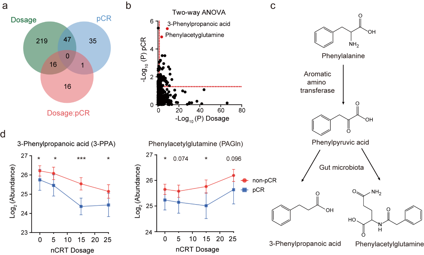 图 2. 3-苯丙酸(3-phenylpropanoic acid)和苯乙酰谷氨酰胺(phenylacetylglutamine)在放化疗过程中与新辅助放化疗的疗效相关(图片来源:Nature Communications)