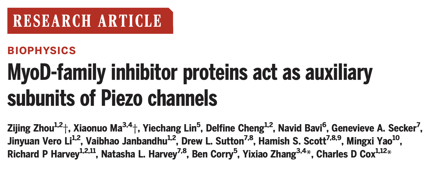 2023年8月18日,澳大利亚Victor Chang心脏研究所Charles Cox课题组与中国科学院上海有机化学研究所生物与化学交叉中心张一小课题组在Science上发表了题为MyoD-family inhibitor proteins act as auxiliary subunits of Piezo channels(MyoD家族抑制蛋白作为Piezo通道的辅助亚基)的合作文章。首次报道了MyoD家族抑制蛋白MDFIC和MDFI是Piezo1/2的结合蛋白,作者通过结构解析和功能研究,发现MDFIC通过C末端一段高度脂质化修饰的两亲性α螺旋从侧面插向Piezo的孔道模块,并证实该α螺旋能够引起外源和内源Piezo1/2的慢失活过程。该研究鉴定了首个Piezo蛋白附属亚基,解释了在许多细胞类型中观察到的内源 Piezo 通道截然不同的门控特性,为Piezo通道功能机制的研究提供了全新的方向。