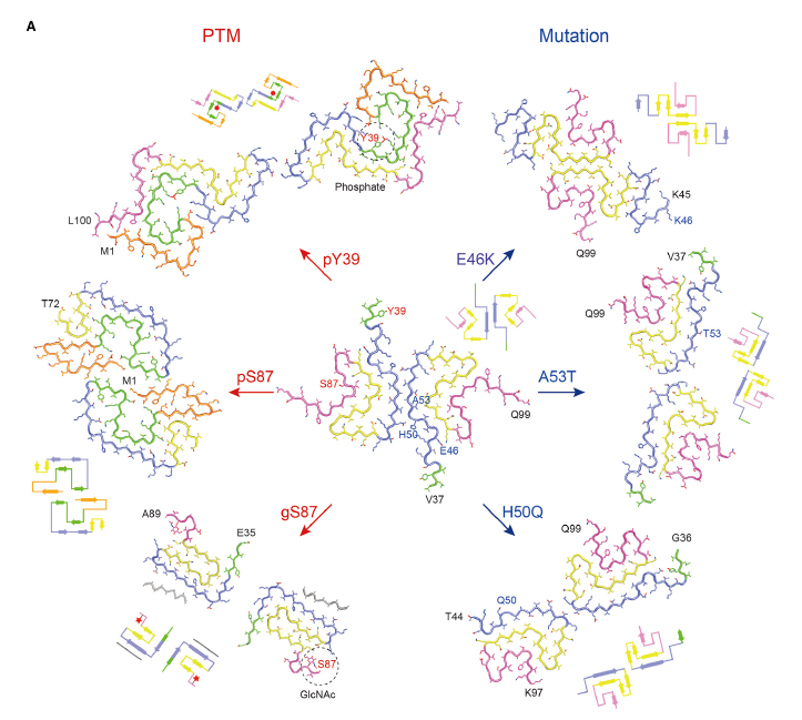 接下来,作者详细地阐明了三大类核心元素——翻译后修饰、与疾病关联的突变以及与纤维相互作用的分子,是如何调控淀粉样纤维的结构多态性,以及其相对应的基础结构。(1)翻译后修饰:通过影响淀粉样蛋白的2D折叠和替代序列采样,显著地影响淀粉样纤维的结构多态性(图2),进而影响它们的纤维毒性。(2)单点疾病相关突变:可以加速聚集过程,加剧神经病理学,加速动物模型中的疾病发病,并产生完全独特的纤维结构。(3)外源性生物分子:如RNA、脂质和纤维结合蛋白也可以通过分子间相互作用使淀粉样纤维核心区域发生结构转变,触发不同多态体的形成。