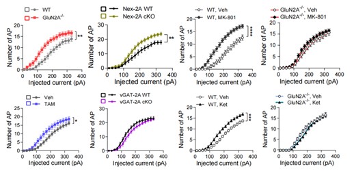 图3:MK-801和氯胺酮处理能增强海马区兴奋性神经元的可兴奋性,且该作用依赖于GluN2A,而非GluN2B。