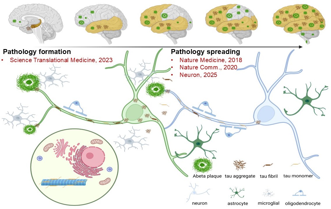 主要关注AD相关神经退行性疾病(ADRD)的病理发生机理。以这一类疾病中的蛋白病理性变化为切入点,研究病理蛋白在神经细胞内变性发生的初始分子机制以及跨脑区传播的细胞生物学机理。
