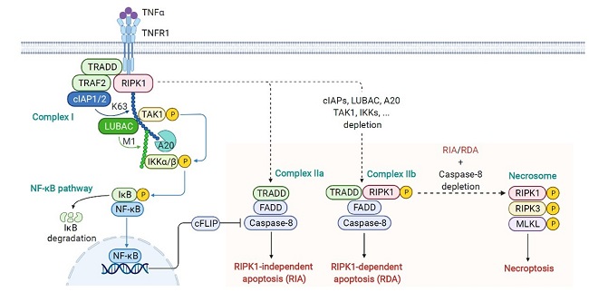 细胞死亡和炎症是人类疾病的共性机制。生理情况下,细胞死亡和炎症具有维持稳态、免疫监视和抵抗感染的功能。疾病情况下,细胞死亡和炎症被过度激活,两者相互促进,导致一系列疾病的发生。正常情况下,细胞死亡受到严密的调控,称之为细胞死亡检查点(Cell-death checkpoints)。以死亡受体TNFR1介导的程序性死亡为例,我们过去的工作鉴定出了多个新的死亡检查点,并揭示了检查点失活导致人类疾病的分子机理。我们发现的TBK1检查点通过对RIPK1的磷酸化作用抑制其激活导致的细胞凋亡和小鼠胚胎死亡,同时还揭示了TBK1检查点突变与衰老协同作用导致RIPK1激活促进渐冻症ALS的分子机制(Cell, 2018)。我们发现的SENP1检查点通过对RIPK1的去SUMO化修饰抑制了细胞凋亡和脂肪性肝炎的发生,揭示了非酒精性脂肪肝炎中肝细胞死亡和炎症的发生机制(Nat Commun, 2022)。我们发现的程序性坏死检查点PARP5A和RNF146通过对RIPK1的PARdU修饰限制了细胞坏死,并揭示了PARP5A和RNF146通过共相分离的形式调控程序性坏死的分子机制(Mol Cell, 2024)。目前实验室已建立起多种基因和小分子筛选策略,致力于揭示更多新的细胞死亡检查点及其失活导致人类疾病的分子机制。