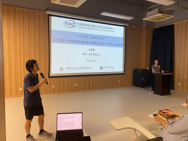 2022年9月7日晚,中国科学院生物与化学交叉研究中心第1期“第一作者讲坛”在交叉中心一楼报告厅举行。本次的主讲人是来自张在荣课题组毕业的王林寒博士,她以“发现促进内质网错误折叠膜蛋白降解的护送因子TMUB1背后的故事”为题,给大家带来了一场精彩的报告。报告由交叉中心贺焯皓研究员主持,张在荣研究员对王林寒同学进行介绍,交叉中心主任袁钧瑛院士出席并为王林寒同学颁发了“第一作者讲坛”纪念奖杯。
