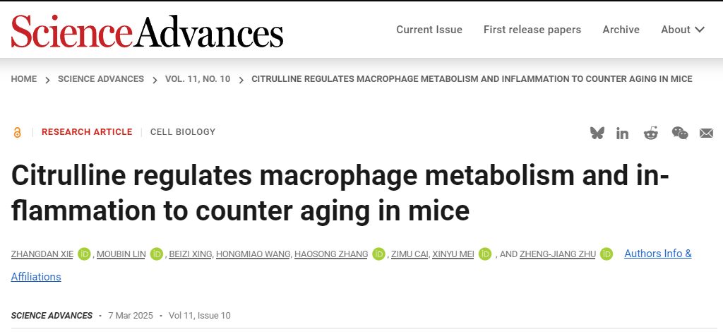 Science Advances | 朱正江团队揭示了代谢物瓜氨酸在巨噬细胞代谢、炎症和衰老过程中的关键调控作用