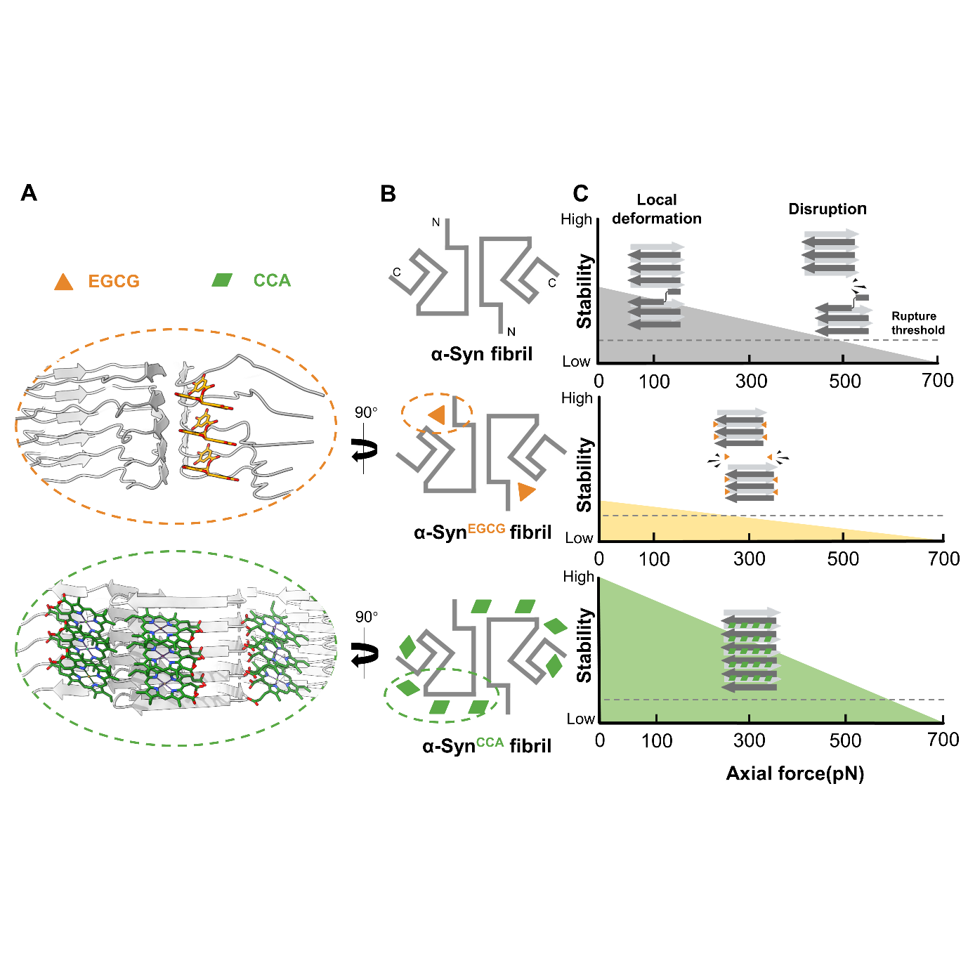 本研究进一步探索了两种化学小分子——表没食子儿茶素没食子酸酯(EGCG)和叶绿素铜A(CCA)对α-syn纤维结构和力学特性的调控作用,研究人员发现EGCG 可嵌入α-syn纤维N端极性沟槽,破坏纤维核心稳定性,并诱导纤维解聚。而CCA 通过结合α-syn纤维的多个不同位点,提高其抗断裂能力,使纤维更加稳定。通过冷冻电镜结构解析,研究团队发现EGCG和CCA作用于不同的纤维界面,分别导致纤维力学特性的相反变化。这一结果表明,针对不同的纤维界面进行靶向干预,可能成为调控α-syn病理纤维的新策略,为未来开发帕金森病等疾病的新型治疗药物分子提供了新的线索。