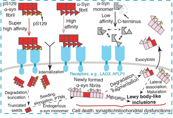 综上,本工作研究了膜受体介导的α-syn病理纤维在细胞间传播的分子机制。首次发现α-syn的C末端作为α-syn病理纤维传播的关键区域,通过结合不同膜表面受体蛋白的正电口袋,介导α-syn病理纤维进入到细胞中,诱导细胞内源非聚集态的α-syn病理性聚集,并引发相应的细胞毒性和死亡等(图2)。在生理状态下,α-syn的C末端被其自身的其他区域所屏蔽而处于自锁状态;而在病理条件下,α-syn单体形成纤维,其C末端被释放并富集在α-syn纤维的表面,从而增强α-syn纤维与受体蛋白的结合。本工作阐明了受体蛋白介导的α-syn病理纤维传播的分子机制,加深了对α-syn病理纤维传播,尤其是S129位磷酸化在其中作用的理解。同时,提出α-syn与受体蛋白之间的作用界面可以作为潜在的抗PD药物筛选的靶点,为PD药物的设计和研发提供了新的思路。