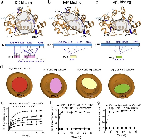 进一步,通过质谱交联实验表征了mN3与其他不同病理淀粉样蛋白的结合,发现mN3均利用其酶活性底物口袋来结合不同的淀粉样蛋白,但其相互作用区域具有差异性(图2)。此外,研究人员发现对于不同的淀粉样蛋白,mN3不但使用其底物口袋的不同区域参与结合,并且介导mN3与不同淀粉样蛋白结合的相互作用类型也不同。对于α-syn和K19这类有负电荷富集区域的底物蛋白来说,静电相互作用对它们与mN3的结合很重要。对于mN3与Aβ40和IAPP的结合来说,疏水作用则起到更重要的作用。