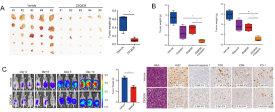 图2. ZSQ836在免疫缺失或正常的小鼠卵巢癌模型中的药效