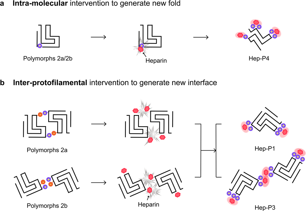 图3. Heparin诱导α-syn形成不同polymorphs的机制示意图。