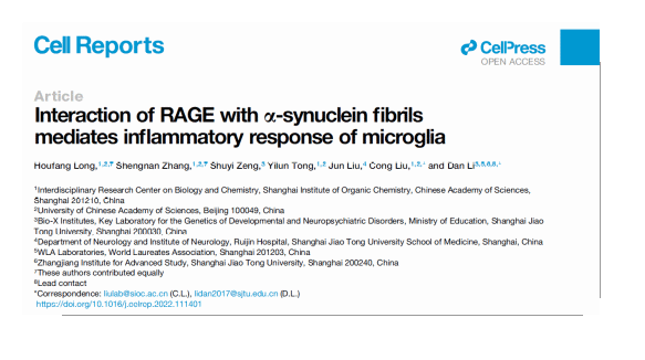 2022年9月20日,中国科学院上海有机化学研究所交叉中心的刘聪研究员团队与上海交通大学Bio-X研究院李丹教授团队合作在Cell Press细胞出版社期刊Cell Reports上发表了一篇题为 “Interaction of RAGE with α-synuclein fibrils mediates inflammatory response of microglia”的研究论文。该研究发现α-syn病理性纤维通过直接结合小胶质细胞表面的RAGE受体来诱导细胞炎症反应,揭示RAGE识别α-syn病理性纤维的分子机制。该工作为通过抑制神经炎症来治疗PD提供潜在的新靶点。