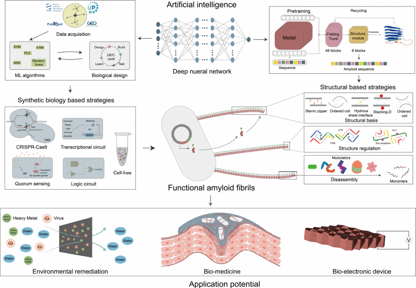 综述首先讨论了淀粉样聚集体的基本结构特征。进一步探讨了两种主要的功能性淀粉样纤维聚集体设计策略的基本原则:1)通过蛋白质模块设计或混合,引入新功能,这类应用包括催化、病毒清除、生物模拟矿化、生物成像和生物治疗等;2)利用合成基因回路动态调控生物体内的淀粉样纤维聚集体,主要应用在形状生成、泄漏修复和压力感测等方面。随后,文章总结了结构生物学技术的突破如何揭示淀粉样纤维聚集体在原子级别的结构多样性,并阐述了淀粉样纤维聚集体的组装和解聚是如何被各种因素精确和多级调控的。这些精准的结构知识对于指导淀粉样纤维聚集体的理性设计,特别是设计具有多种生物活性和可调控属性的淀粉样纤维聚集体,具有重要的意义。最后,文章展望了整合结构可调性、合成生物学和人工智能可能带来的功能性淀粉样纤维聚集体设计新趋势。