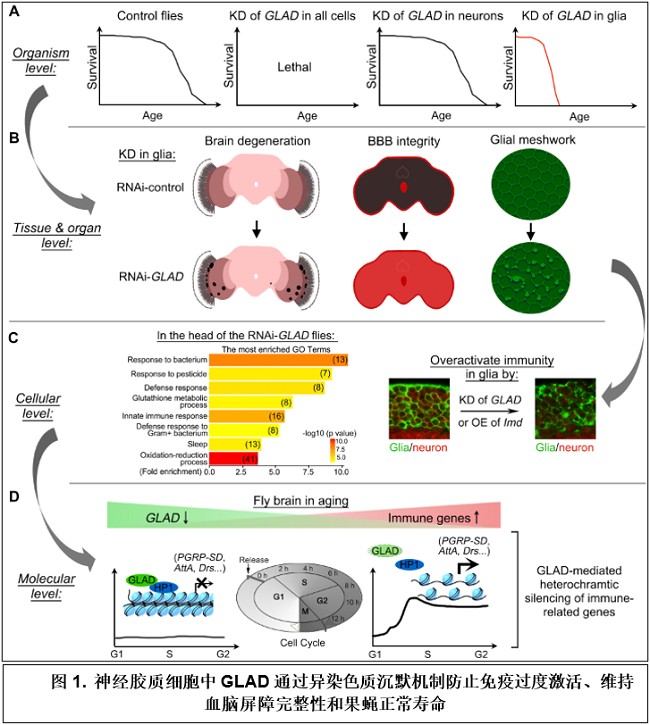 在接下来的机制解析中,作者们发现果蝇的GLAD基因编码一个异染色质结合蛋白,对于组蛋白基因如H2A和H3在细胞分裂S期的一过性短暂高表达和及时下调发挥着重要调控作用。更有趣的是,GLAD蛋白还与多种免疫相关基因的启动子区域结合,使得这些基因的表达在细胞分裂过程中保持沉默;而下调GLAD水平会引起一系列免疫相关基因在细胞分裂的S期和G2/M期发生持续性异常表达。并进一步揭示,果蝇大脑中GLAD 水平随着年龄逐渐下降,使其对胶质细胞中免疫相关基因表达的抑制作用逐渐减弱,这可能是基因组水平果蝇免疫基因随年龄上调、抗菌肽过度表达并引起血脑屏障通透性改变的一个主要原因(图1)。