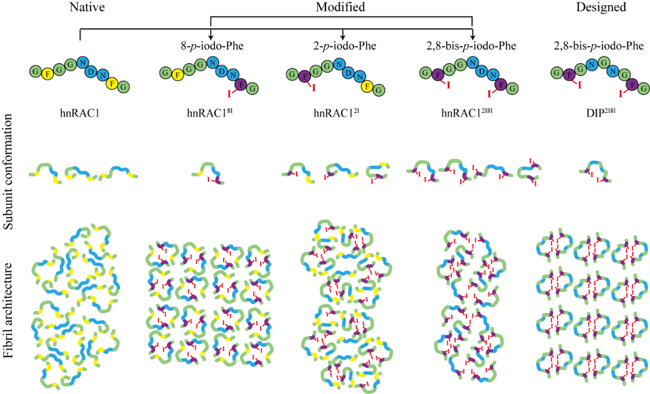 此外,通过在hnRAC1的不同位点引入碘原子修饰,研究人员发现,碘化修饰能诱导hnRAC1形成具有不同原子结构及热稳定性的淀粉样纤维“万花筒”(图1)。进一步的研究发现,这些具有不同结构的多肽淀粉样纤维的自组装是由多肽分子内与分子间形成的各种类型的卤键驱动(表1)。例如,在Phe8的苯环上引入碘原子的hnRAC18I,诱导形成一种分子内C–I···π卤素键,从而将肽链锁定在单一的构象中,组装形成的纤维的截面结构为方形。而在周围区域具有柔性较强Gly的Phe2的苯环上引入碘原子的hnRAC12I或在Phe2的苯环和Phe8的苯环上均引入碘原子的hnRAC12I8I,都会形成多个不同类型的分子间卤素键,诱导产生多种肽链构象。hnRAC12I和hnRAC12I8I组装形成的纤维的界面具有类似于花瓣形的结构(图2)。进一步,研究人员基于对hnRAC1和三种不同碘化多肽纤维原子结构与自组装机制的理解,通过理性设计获得了具有全新结构的碘化肽DIP2I8I淀粉样纤维(图2)。