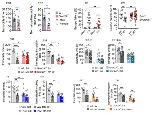 在这项研究中,作者们使用了多种GluN2A基因敲除小鼠进行了行为学和电生理评估,发现GluN2A的缺失足以缓解小鼠的抑郁样行为,并且氯胺酮的抗抑郁活性依赖于GluN2A的存在,但是非氯胺酮类的抗抑郁药物起效则并不需要GluN2A(图一)。