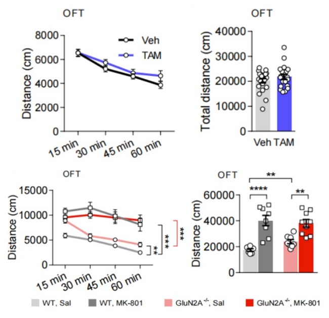 图2:成年后敲除GluN2A不引起与致幻相关的精神分裂样行为,且MK-801(氯胺酮类似药物)诱导精神分裂样表型并不依赖于GluN2A。