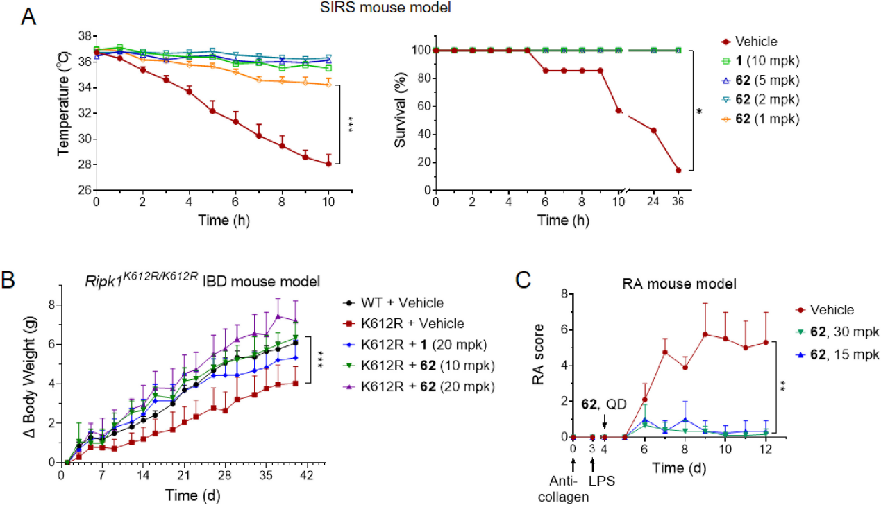 谭立课题组与袁钧瑛课题组在研究中意外发现,一种被报道在多种鼠源细胞上低效的RIPK3抑制剂GSK’840,能在L929小鼠纤维细胞上有效抑制程序性坏死、同时不诱导凋亡。于是,研究团队基于GSK’840的骨架及其潜在的变构抑制机制,设计合成了一系列II型激酶抑制剂以进一步提升抑制活性。然而,这类II型激酶抑制剂意外地展示出对RIPK1激酶的偏好性。基于疏水口袋特征、复合物共晶结构解析和理性设计,研究团队成功地获得了多个骨架新颖的II型RIPK1激酶抑制剂。通过同时作用于ATP结合口袋和疏水变构口袋,这些抑制剂在人源和鼠源细胞程序性坏死模型上均展示出亚纳摩尔乃至皮摩尔级的EC50,活性显著优于临床试验中的RIPK1抑制剂,同时兼顾了高选择性。多个抑制剂还展示出良好的药代动力学性质,其中化合物62能以1 mpk灌胃的低剂量有效缓解TNF在小鼠体内诱导的炎症风暴,同时在慢性肠炎和关节炎小鼠模型中也展示出理想的药效与耐受性。这些发现不但为细胞程序性坏死抑制剂的理性设计提供了新颖的化学骨架和药效团模型,也为相关炎症性疾病的临床新药创制提供了极具成药潜质的先导化合物。
