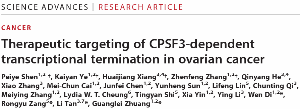 中国科学院上海有机化学研究所生物与化学交叉研究中心、生命过程小分子调控全国重点实验室的谭立课题组曾与仁济医院、上海市妇科肿瘤重点实验室的庄光磊、狄文课题组合作,针对卵巢癌细胞中调控转录延伸过程的关键因子CDK12/13研制了一系列新型激酶抑制剂,并在动物肿瘤模型上取得了很好的抑癌效果。近期,他们又针对卵巢癌细胞中催化mRNA剪接、调控转录终止的CPSF复合物关键组件——CPSF3——研制了新型的小分子抑制剂,并在Science Advances期刊上以共同通讯作者身份发表相关研究论文“Therapeutic targeting of CPSF3-dependent transcriptional termination in ovarian cancer”。