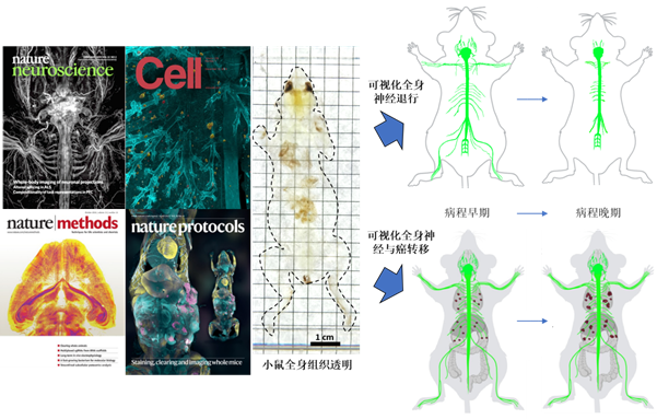 本课题组以往工作已经建立了多种全身组织透明成像技术(Cell 2019, Nature Neuroscience 2019, Nature Methods 2016, Nature Protocols 2023, 均为封面论文),首次实现小鼠全身样本高分辨率完整荧光成像,使高通量全系统无偏化分析成为可能,并进一步运用这些技术在神经生物学、癌症生物学等众多生物医学研究领域产生了之前难以被研究的新发现。本课题组现阶段的研究重心集中于以下三个方向: