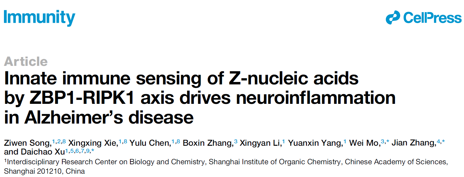 On September 2, 2025, the professor Daichao Xu’s Lab from the Interdisciplinary Research Center on Biology and Chemistry, Shanghai Institute of Organic Chemistry, Chinese Academy of Sciences, published a research paper called "Innate immune sensing of Z-nucleic acids by ZBP1-RIPK1 axis drives neuroinflammation in Alzheimer's disease" in Immunity. This article revealed that oxidatively fragmented Z-form mitochondrial DNA (Z-mtDNA) acts as a novel endogenous ligand for ZBP1, which drives the neuroinflammatory process mediated by microglia in AD. This discovery provides a new perspective for understanding the sensing of left-handed nucleic acids and the regulatory mechanism of neuroimmune in AD.