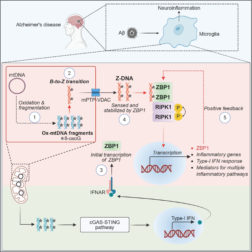 Xu’s lab discovered that in the pathological environment of AD, Aβ induced mitochondrial reactive oxygen species (mtROS) in microglia oxidized mtDNA guanine oxidizaition to generate 8-oxoG DNA. Subsequently, oxidized mtDNA was fragmented by mitochondria nucleases and released into the cytoplasm through the mPTP-VDAC channel. These 8-oxoG-containing mtDNA fragments undergo conformational changes to form Z-DNA, which can be specifically recognized by ZBP1 to mediate RIPK1 recruitment and subsequently kinase activation. This process simultaneously promotes multiple pro-inflammatory pathways such as type I interferons, TLR signaling, and NLRP3 inflammasome (Figure 1), ultimately leading to neuroinflammation and AD pathology.