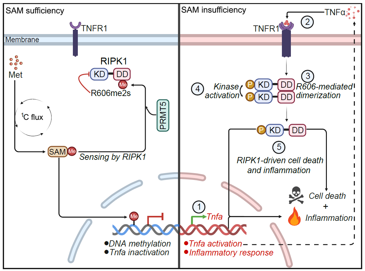 In summary, this study identifies RIPK1 as a novel sensor for SAM abundance, capable of responding to methionine and SAM metabolic changes to control cell fate decisions. SAM deficiency contributes to the development of diseases related to cell death and inflammation. Given that RIPK1 inhibitors have shown promise in clinical trials for various inflammatory and degenerative diseases, this research suggests RIPK1 as a potential therapeutic target for human diseases associated with SAM dysregulation.