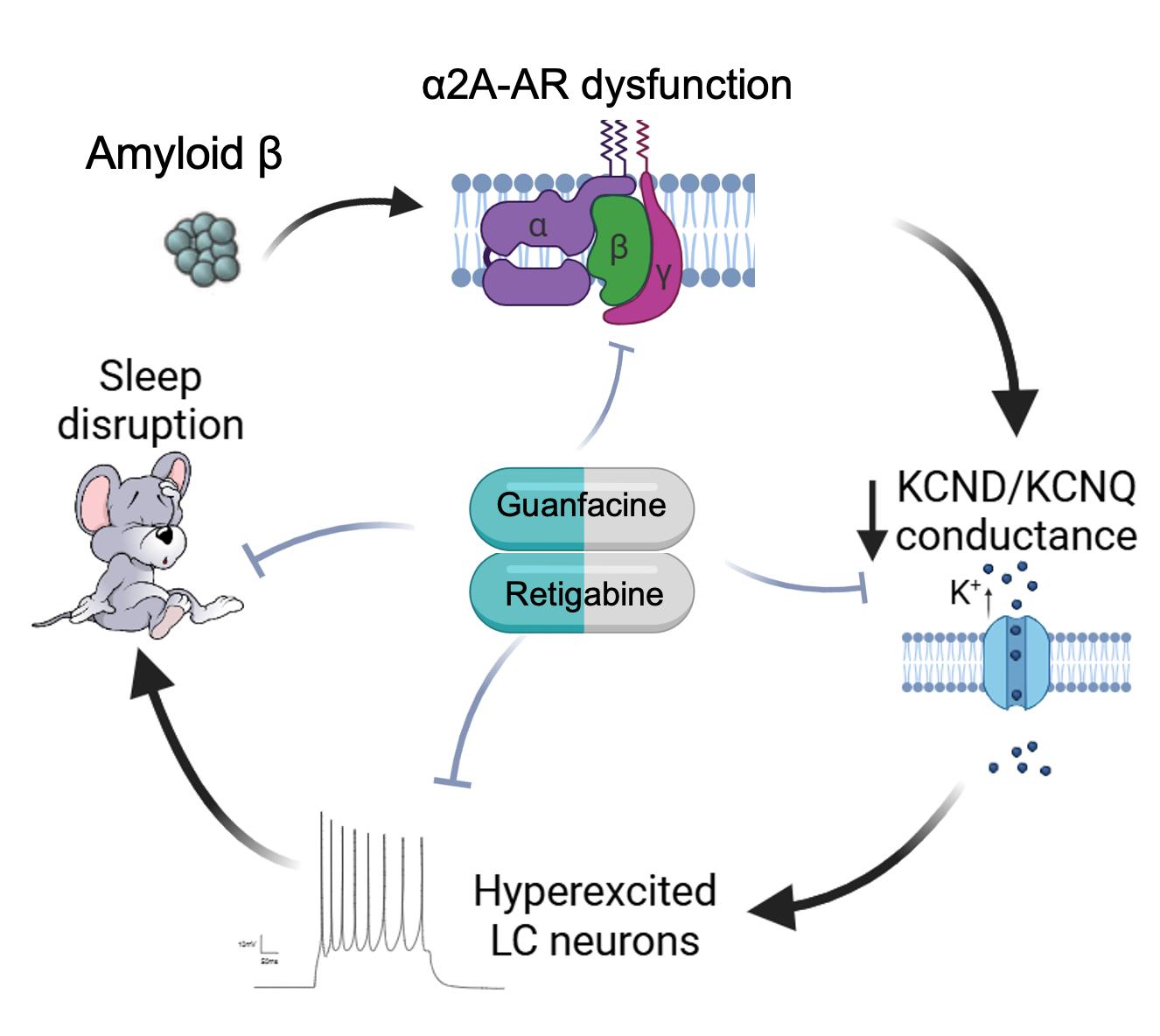 This study not only identifies the locus coeruleus as a key brain region driving early sleep disturbances in AD but also elucidates the molecular and circuit mechanisms underlying these changes. Moreover, it highlights α2A adrenergic receptors and Kv7 potassium channels as promising therapeutic targets for early intervention, providing new insights for the development of precision treatments targeting prodromal sleep symptoms in AD.