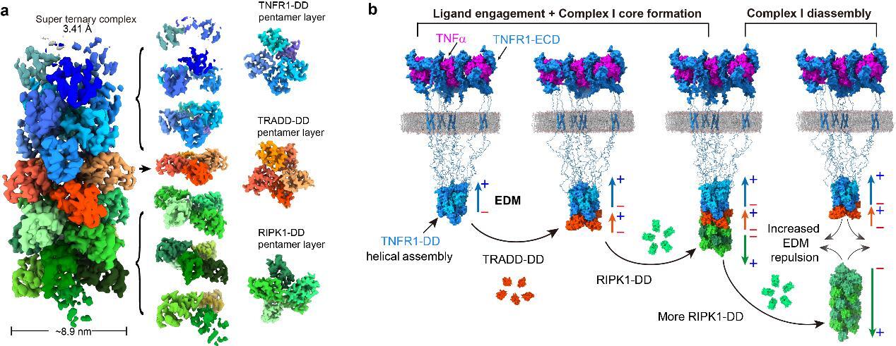 Tumor necrosis factor receptor-1 (TNFR1) is a pro-inflammatory transmembrane receptor with multifaceted functions ranging from inflammation, innate immune to cell death. The outcome of TNFR1 signaling is determined by a complex beneath cell membrane triggered by the engagement of the extracellular ligand. This so-called “Complex-I” is a transient signalosome featuring dynamic assembly and disassembly, which determines the signaling strength of downstream pathways and cell fate. The dynamics of Complex-I is manifested as the rapid recruitment of two intracellular components, TRADD and RIPK1, within a few minutes and the rapid disassociation of RIPK1 after that. Despite the tremendous biological importance of the dynamic nature of Complex-I, the driving force behind the dynamics of Complex-I is a long-standing enigma in receptor biology for decades.