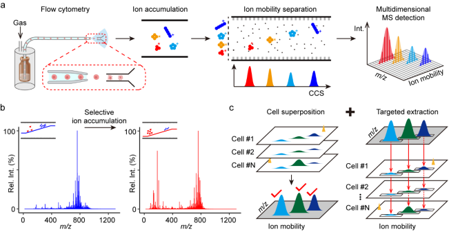 Researchers first established an ion mobility-resolved mass cytometry platform by integrating flow cytometry with ion mobility–mass spectrometry (IM–MS). The system continuously injects live cells into the IM–MS for direct electrospray ionization, transfers the pulsed single-cell ions that are generated into an ion trap for accumulation, and performs ion mobility separation with multidimensional measurements. To improve the detection of low-mass metabolites and reduce interference from cellular lipids, researchers implemented selective ion accumulation in the low-mass range on trapped ion mobility spectrometry. With this strategy, the abundance of low-mass ions was enhanced, increasing the sensitivity of detection for low-mass metabolites by 20-fold compared to the default condition. In addition, to address the low robustness of low-mass metabolites, a cell superposition strategy was developed. This strategy leverages distinctive ion signatures characterized by mass-to-charge ratio (m/z) and ion mobility values to aggregate identical ions across multiple cells. It enhanced peak detection and guided targeted ion extraction in individual cells, thereby improving robustness while maintaining single-cell resolution. This strategy elevated the median signal-to-noise ratio by 33-fold in peak detection and reduced metabolite dropout rates from 82% to 6% in quantification. Together, the selective ion accumulation and cell superposition enabled attomole-level sensitivity and a broad dynamic range at the single-cell level.