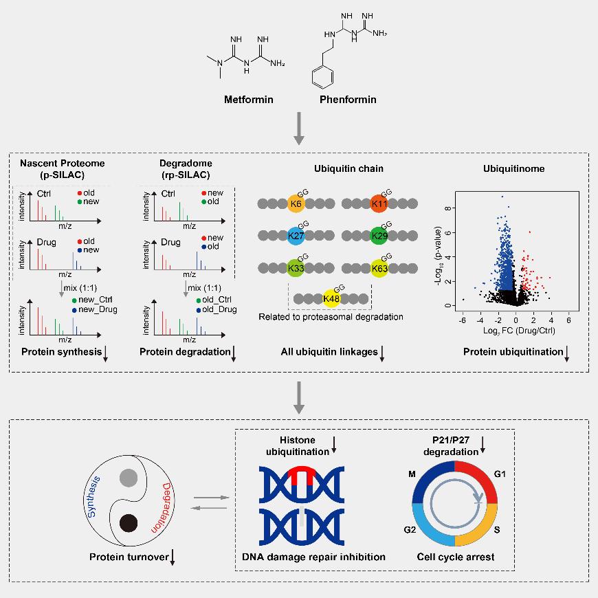 综上,本研究通过整合多维蛋白质组学——包括定量蛋白质组学、泛素化组学分析以及基于同位素代谢标记的蛋白质更迭研究——系统阐明了二甲双胍通过抑制蛋白质更迭和泛素化水平,从而维持细胞内蛋白质稳态的作用机制。值得强调的是,蛋白质稳态与泛素化调控几乎参与所有关键的生物学过程,这为二甲双胍的多重生物学效应提供了重要的药理学基础。进一步地,本研究揭示了二甲双胍通过下调蛋白质周转和泛素化水平,调节DNA损伤修复及细胞周期进程的机制联系,深化了对其药理作用的理解,并为相关药物的机制研究与新药开发提供了新的思路(图2)。