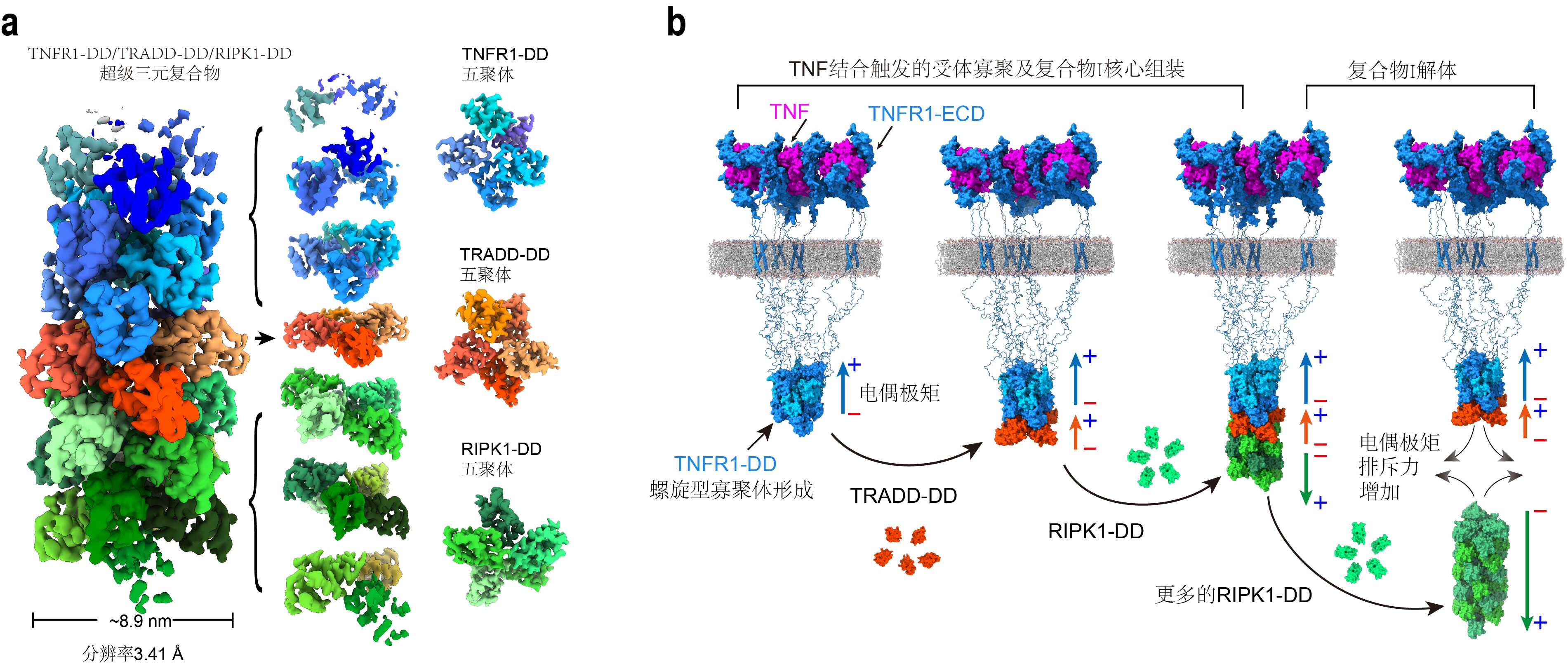 图 1. TNFR1信号复合物动态组装和解体的机制。(a)由TNFR1、TRADD和RIPK1组成的螺旋型超大复合物;(b)死亡结构域之间的电偶极矩(EDM)相互作用驱动了复合物的快速组装和解体。